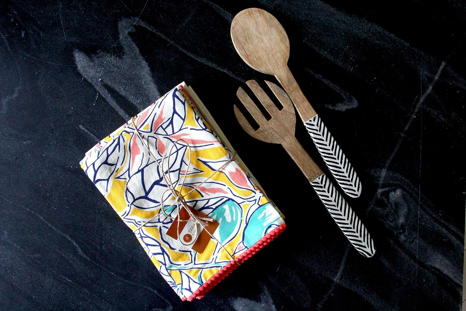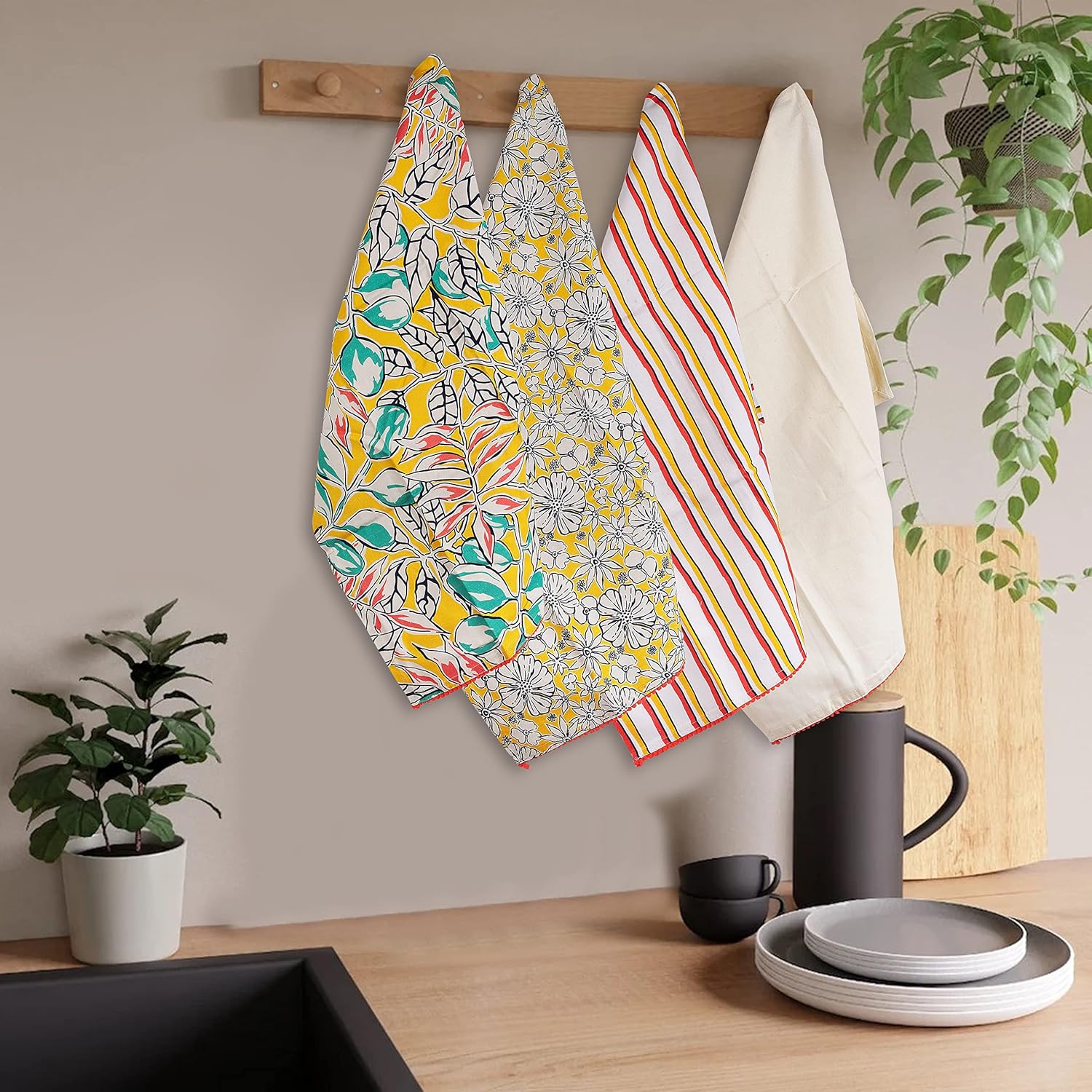 - PACKAGE CONTENT & SIZE : The durable cotton cloth measures approx 18"x28" set of 4 printed kitchen & table linens Cloth Napkins Set of 4 includes: 3 All Overall hand printed Dish towel and a complimentory Printed Dish towel. so you’ll always have plenty on hand. Lint free quick dry comes with hanging loops and no color fade after multiple wash Its perfect for everyday use.
